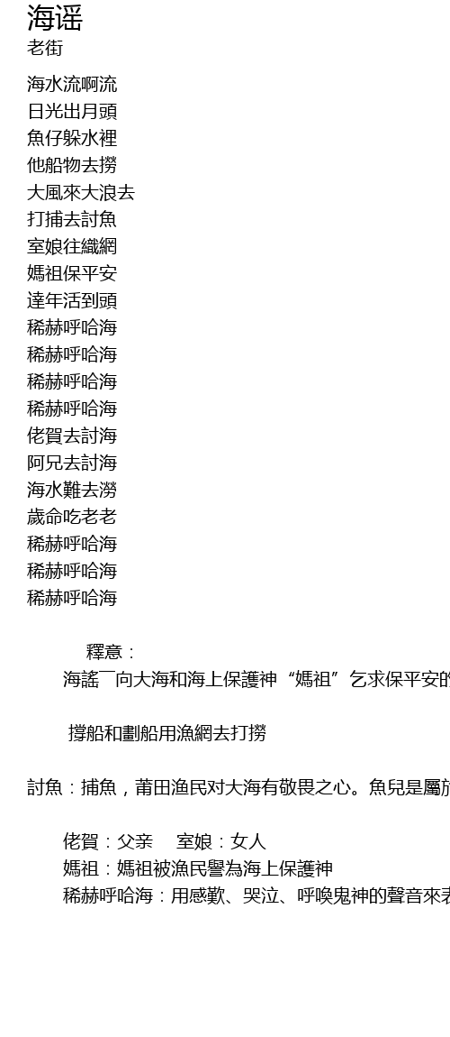 | 海謠――向大海和海上保護神“媽祖”乞求保平安的歌謠,保佑出海捕魚的男人平安歸來。 | |