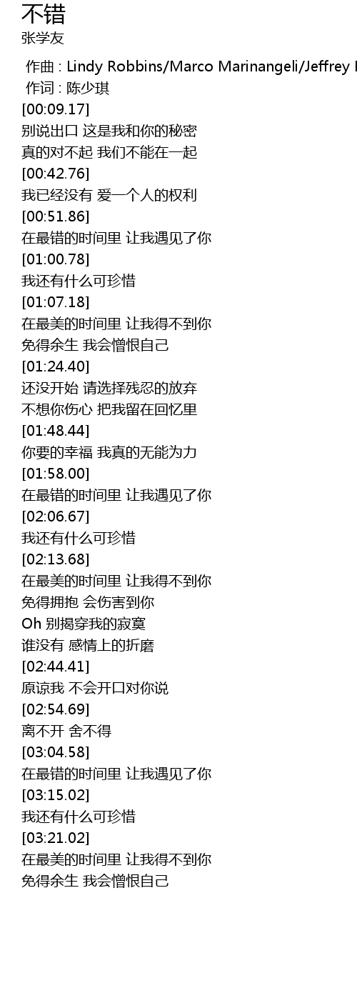 | [01:59.47] | zai zui cuo de shi jian li rang wo yu jian le ni |