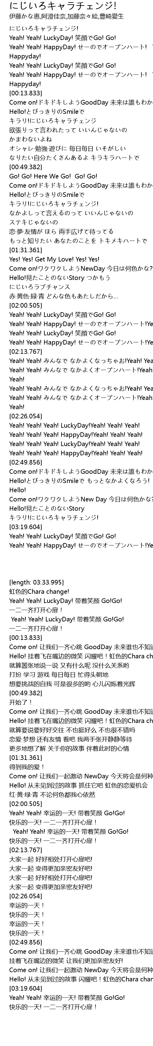 | [03:14.227] | Hello! 从未见到过的故事 闪耀吧!虹色的Chara change! |