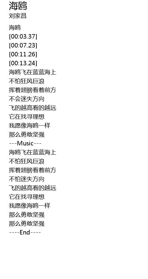 | [00:15.04] | 海鸥飞在蓝蓝海上 |