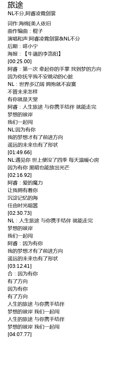 | [01:22.89] | 阿睿:人生旅途 与你携手结伴 就能走完 |