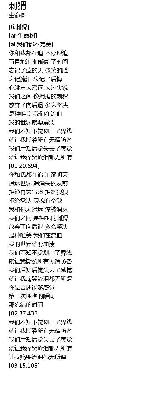 | [01:43.182] | 我们之间 是拥抱的刺猬 |