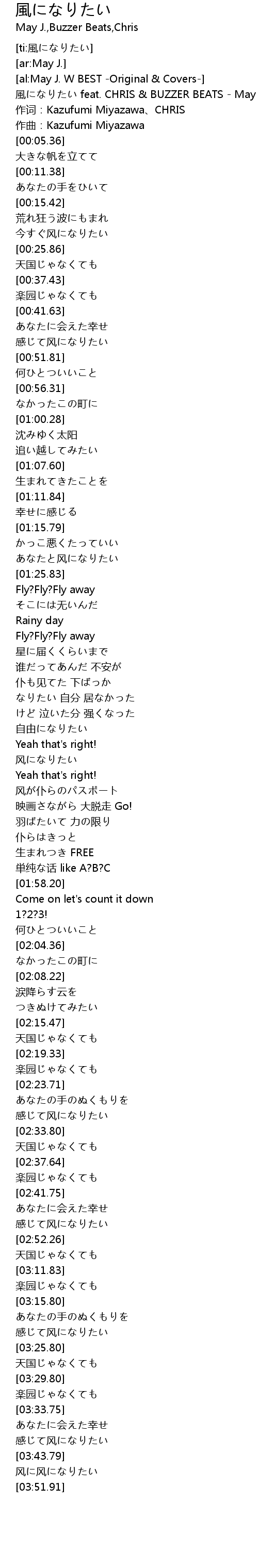 | [00:00.66] | 風になりたい feat. CHRIS & BUZZER BEATS - May J. |