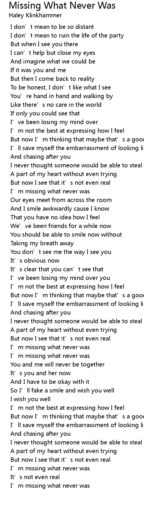 | [02:36.859] | I’m missing what never was |