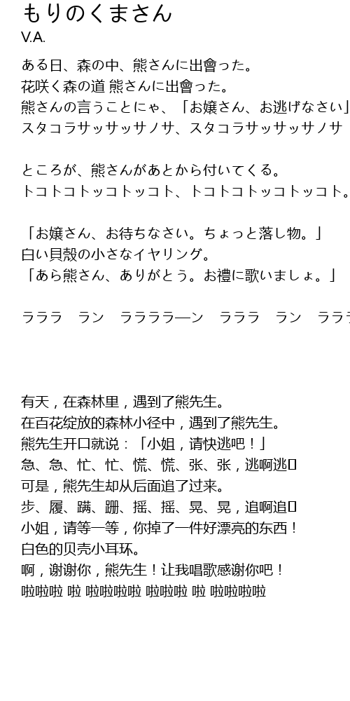| [00:08.72] | ある日、森の中、熊さんに出會った。 |