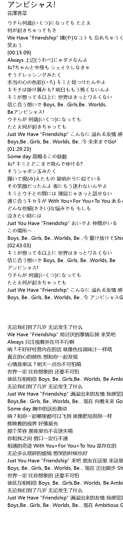 | [03:32.31] | Boys, Be…Girls, Be…Worlds, Be…今 アンビシャスGo! |