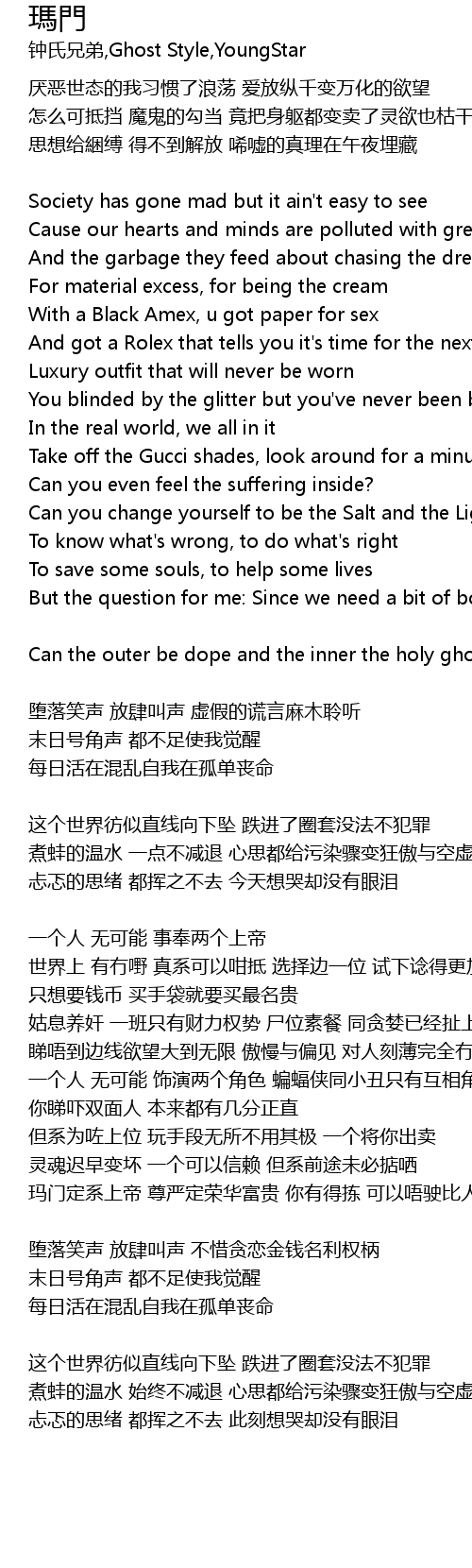 | 但系为咗上位 玩手段无所不用其极 一个将你出卖 灵魂迟早变坏 一个可以信赖 但系前途未必掂哂 玛门定系上帝 尊严定荣华富贵 你有得拣 可以唔驶比人控制 | |