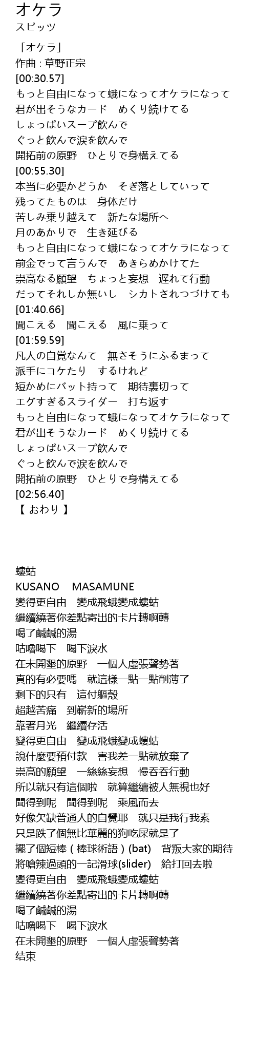 | [00:32.57] | もっと自由になって蛾になってオケラになって |