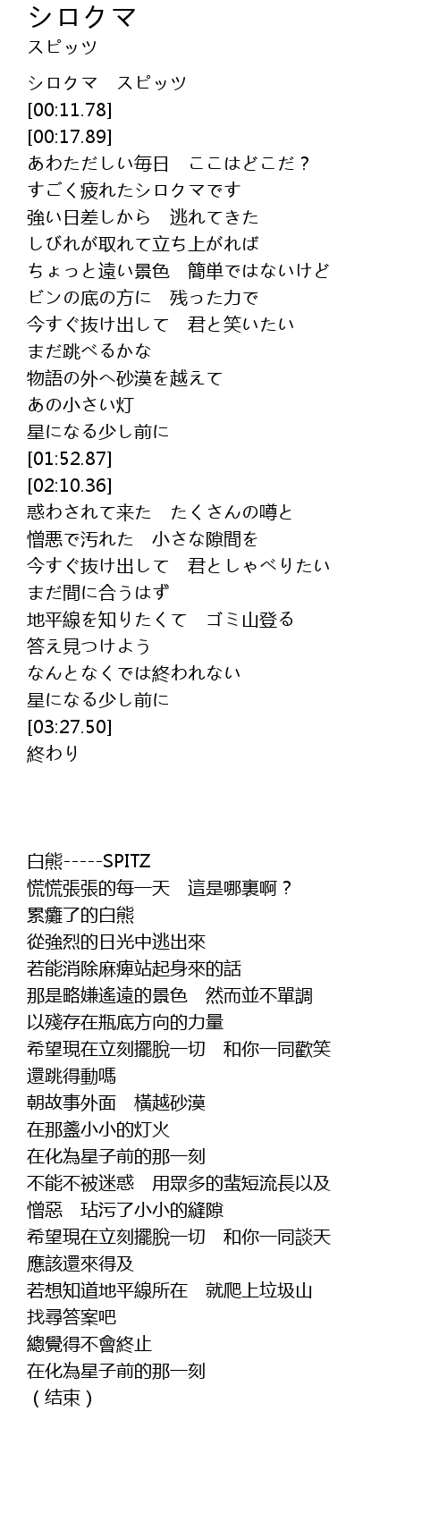 | [00:02.38] | シロクマ スピッツ |
