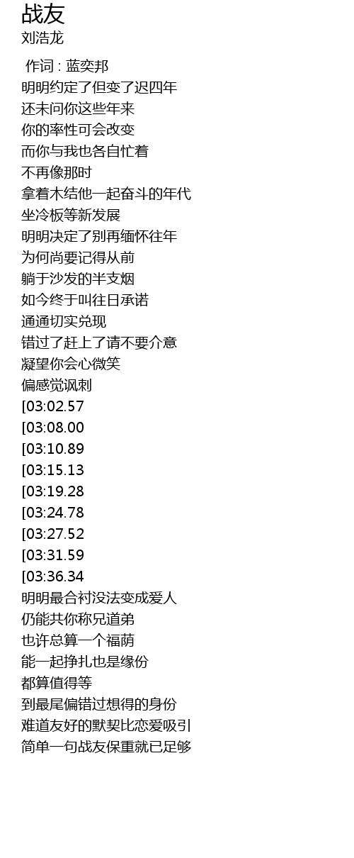 | [01:34.00][03:02.57] | 是你这个战友捱到尽头 |