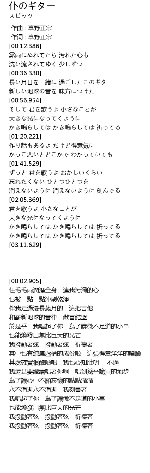 | [00:36.811] | 長い月日を一緒に 過ごしたこのギター |