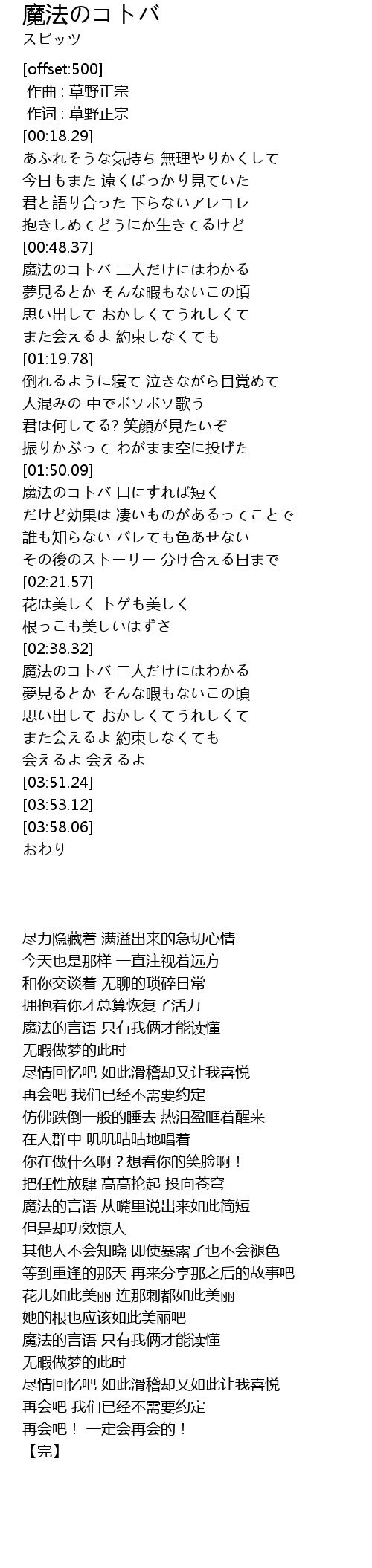 | [00:01.00] | 作词 : 草野正宗 |