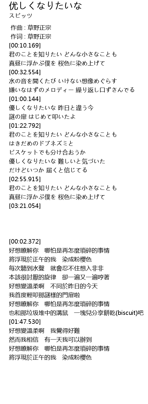| [01:02.388] | 優しくなりたいな 昨日と違う今 |