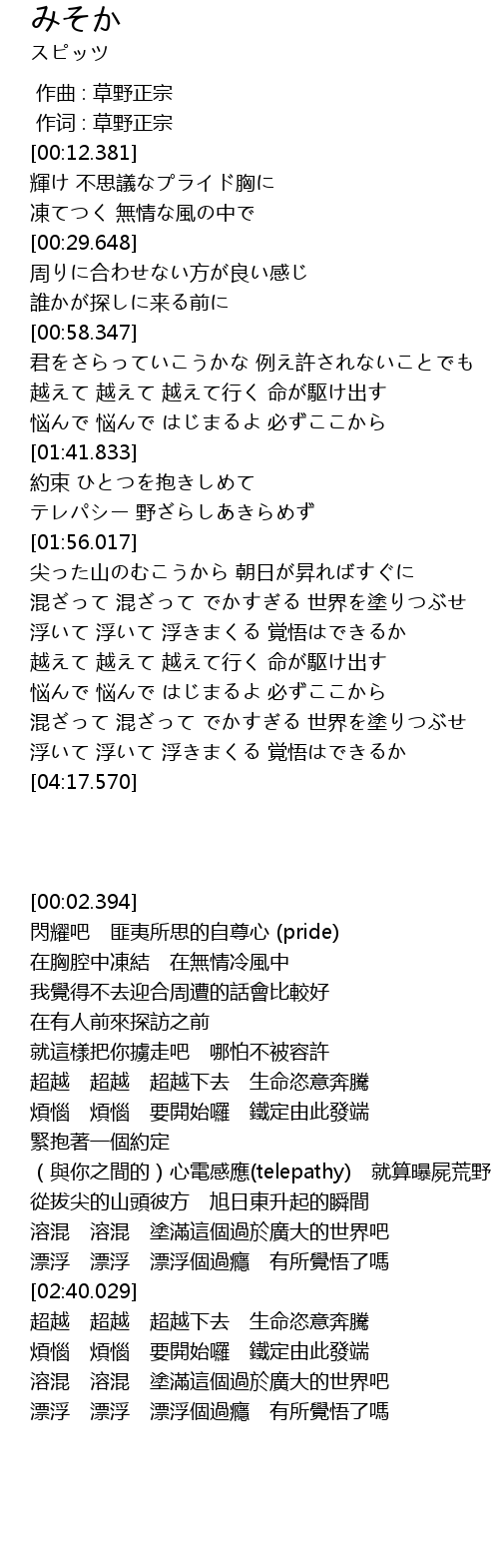 | [01:48.860] | (與你之間的)心電感應(telepathy) 就算曝屍荒野 也不放棄 |