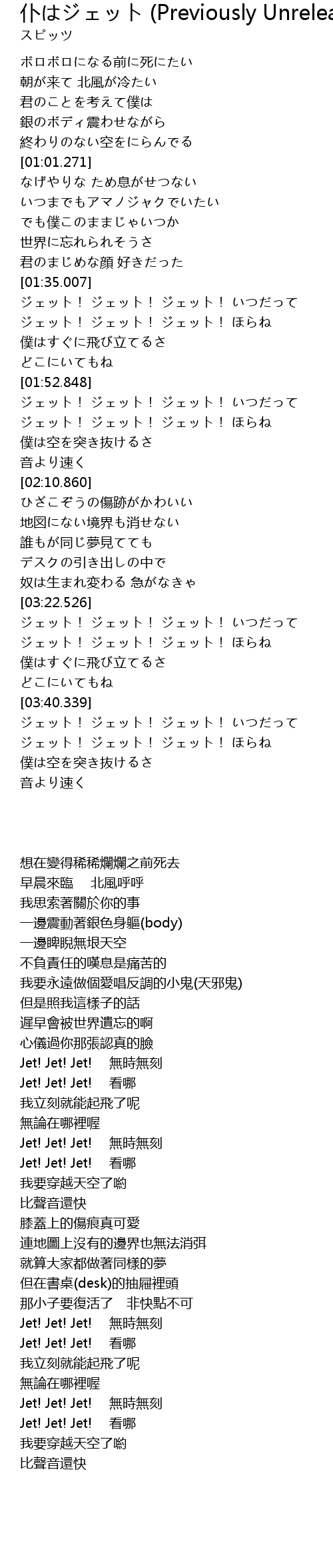| [01:38.614] | Jet! Jet! Jet! 無時無刻 |