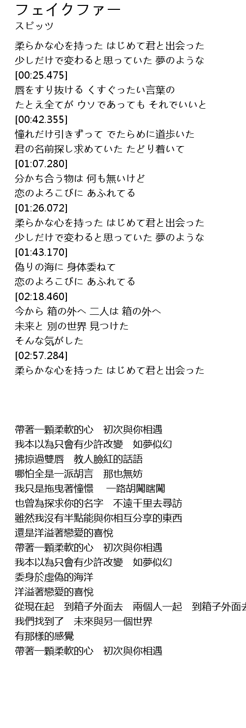 | [03:02.389] | 柔らかな心を持った はじめて君と出会った |