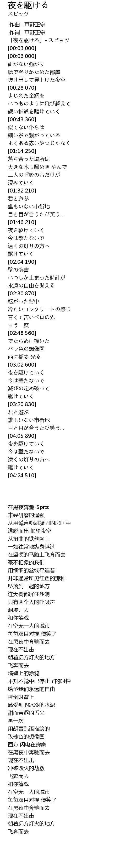| [00:01.000] | 「夜を駆ける」- スピッツ |