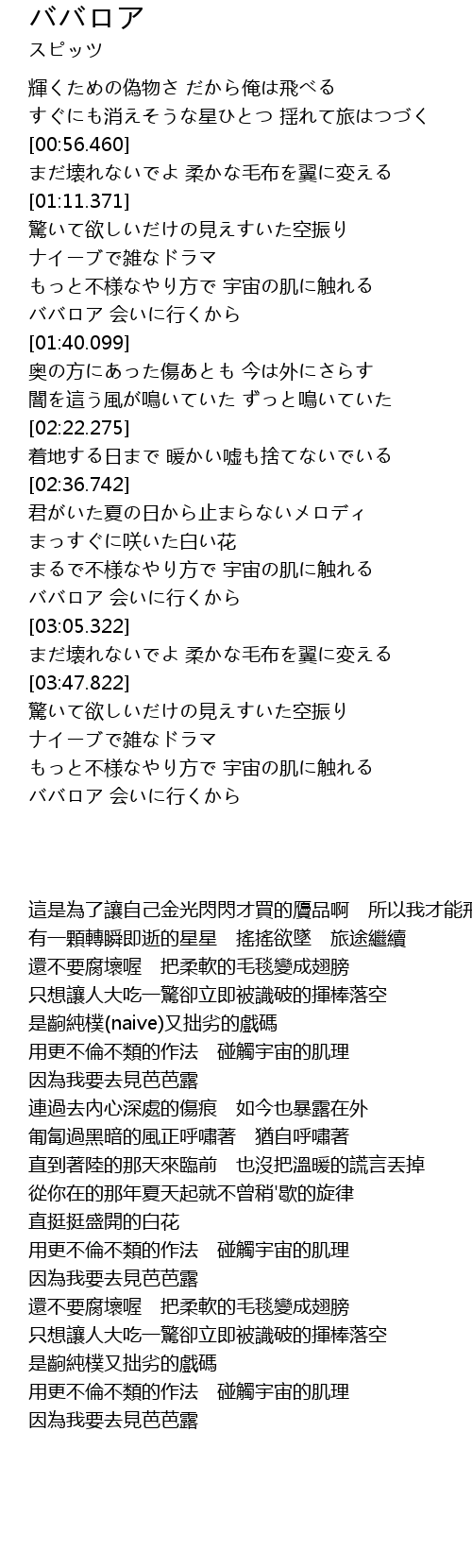 | [02:22.431] | 直到著陸的那天來臨前 也沒把溫暖的謊言丟掉 |
