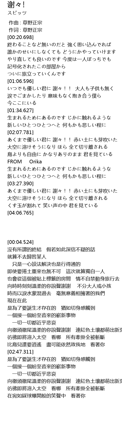 | [01:07.784] | いつでも優しい君に 謝々!! 大人も子供も無く |