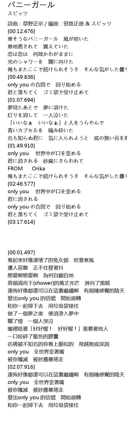 | [00:01.497] | 詩曲:草野正宗/編曲:笹路正徳 & スピッツ |