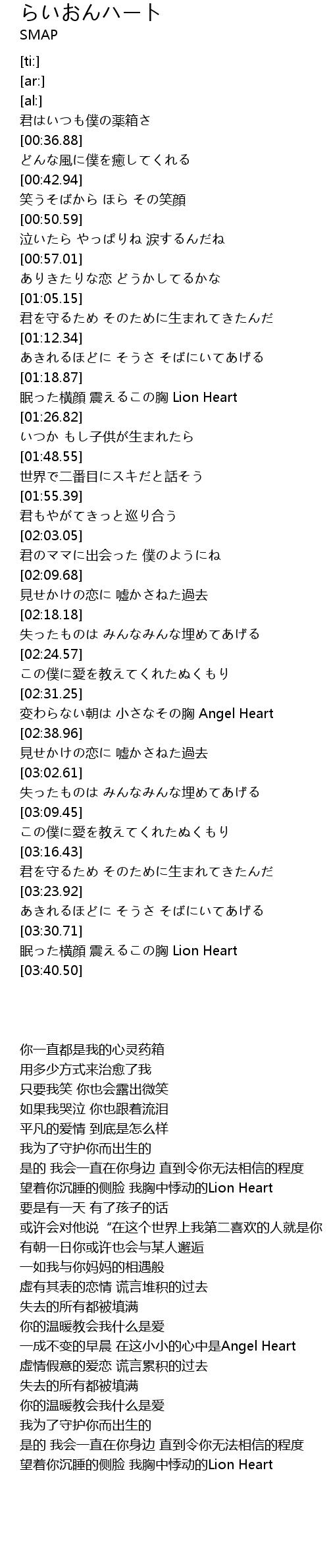 | [03:31.98] | 眠った横顔 震えるこの胸 Lion Heart |