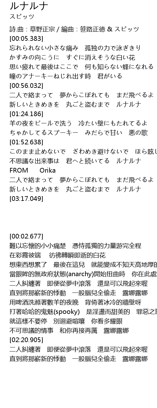 | [00:02.677] | 詩.曲:草野正宗/編曲:笹路正徳 & スピッツ |