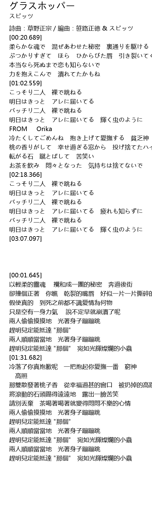 | [00:01.645] | 詩曲:草野正宗/編曲:笹路正徳 & スピッツ |