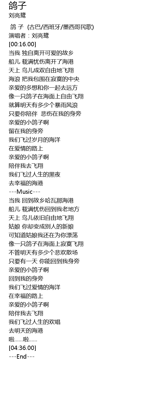 | [00:00.41] | 鸽 子 (古巴/西班牙/墨西哥民歌) |