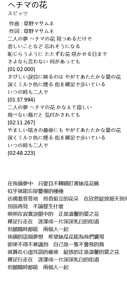 | [01:45.068] | 二人の夢 ヘチマの花 かなえて欲しい |
