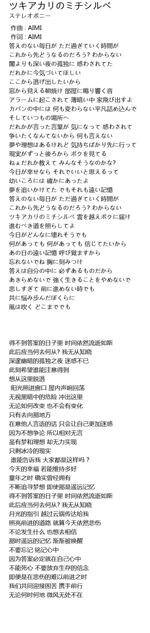 | [02:25.050] | ツキアカリのミチシルベ 雲を越えボクに届け |