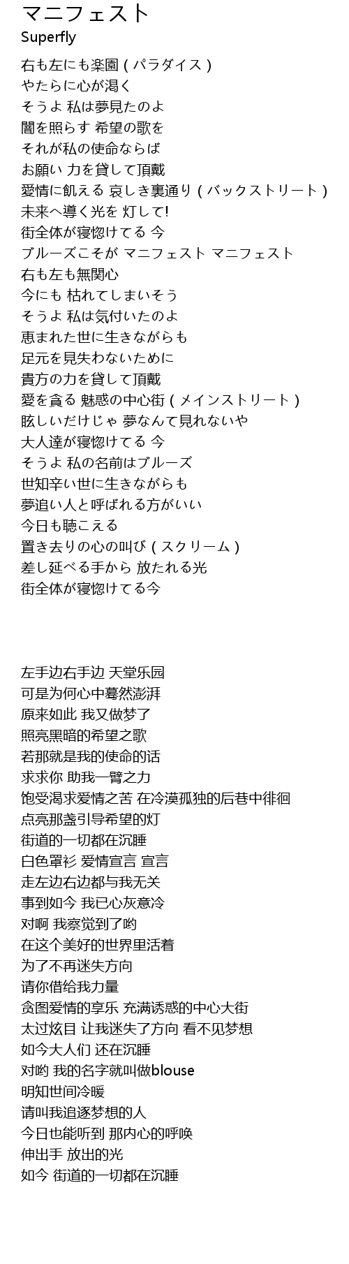 | [01:09.83] | ブルーズこそが マニフェスト マニフェスト |