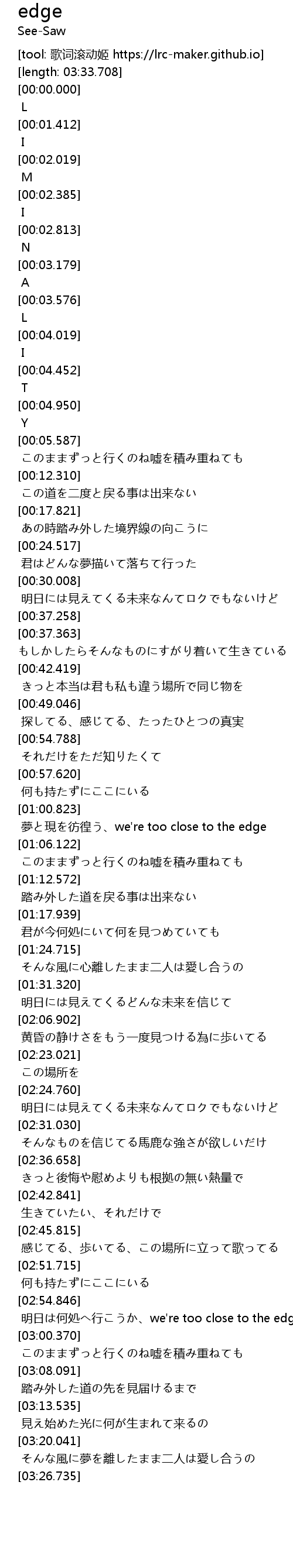 | [01:01.092] | 夢と現を彷徨う、we're too close to the edge |