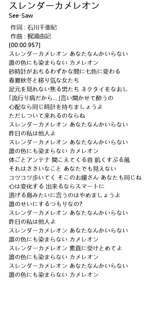| [00:04.934] | スレンダーカメレオン あなたなんかいらない |
