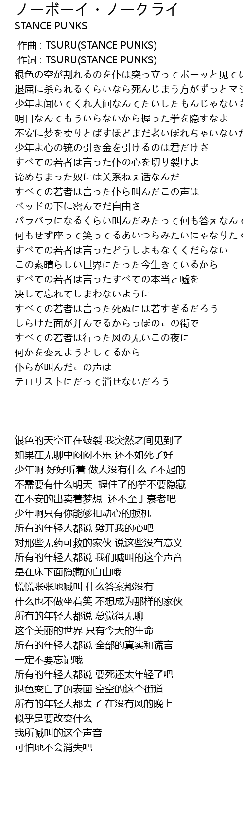 | [00:01.00] | 作词 : TSURU(STANCE PUNKS) |