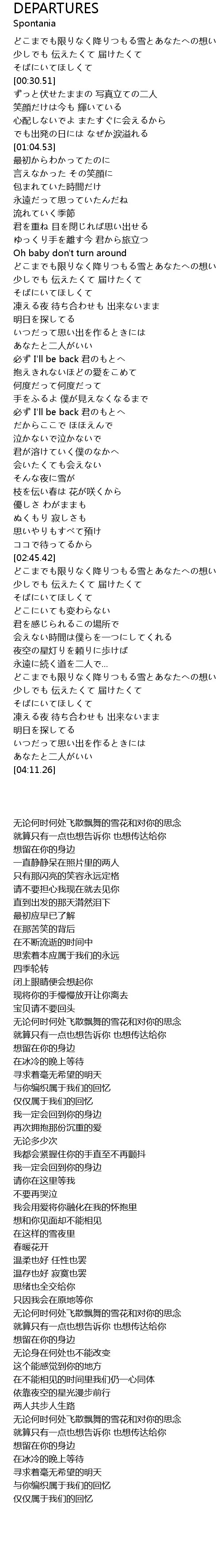 | [02:47.72] | どこまでも限りなく降りつもる雪とあなたへの想い |
