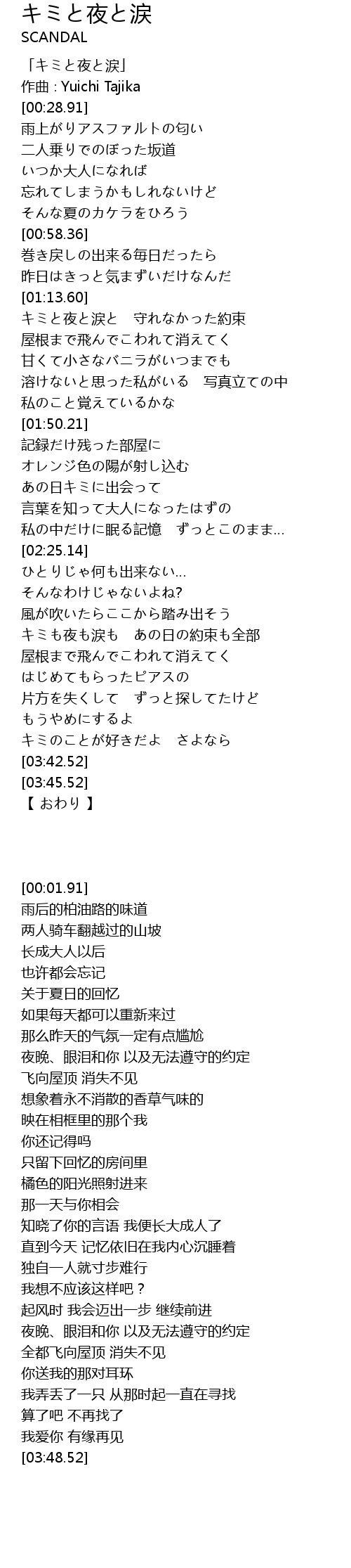| [03:08.18] | 夜晚、眼泪和你 以及无法遵守的约定 |