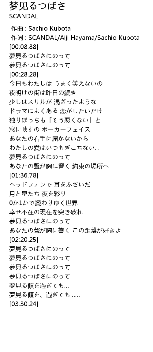 | [00:01.00] | 作词 : SCANDAL/Aiji Hayama/Sachio Kubota |