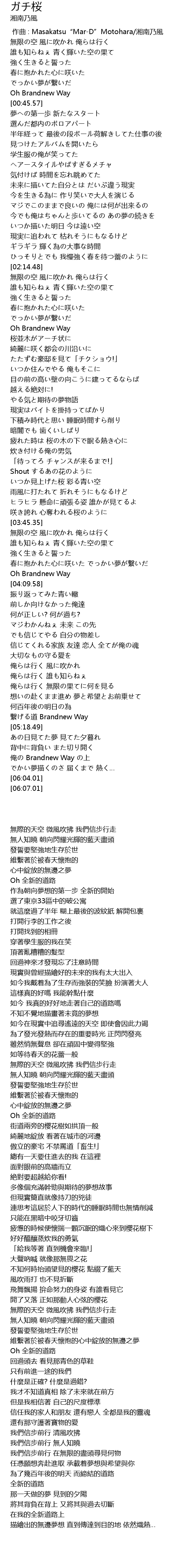 | [00:00.00] | 作曲 : Masakatsu“Mar-D”Motohara/湘南乃風 |