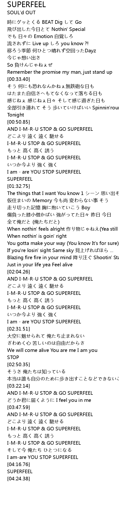 | [02:19.81] | I-M-R-U STOP & GO SUPERFEEL |