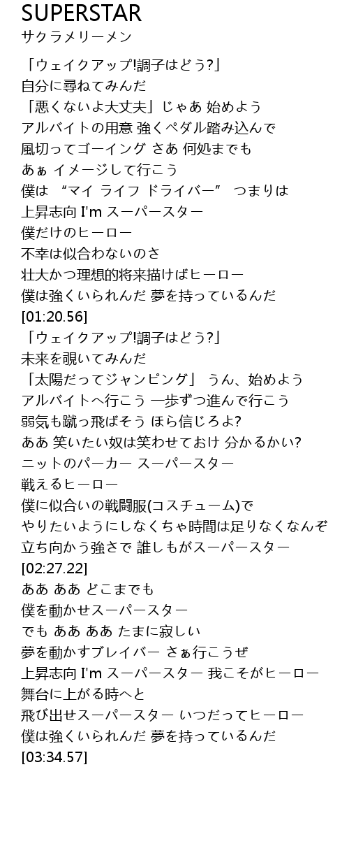| [03:19.60] | 飛び出せスーパースター いつだってヒーロー |