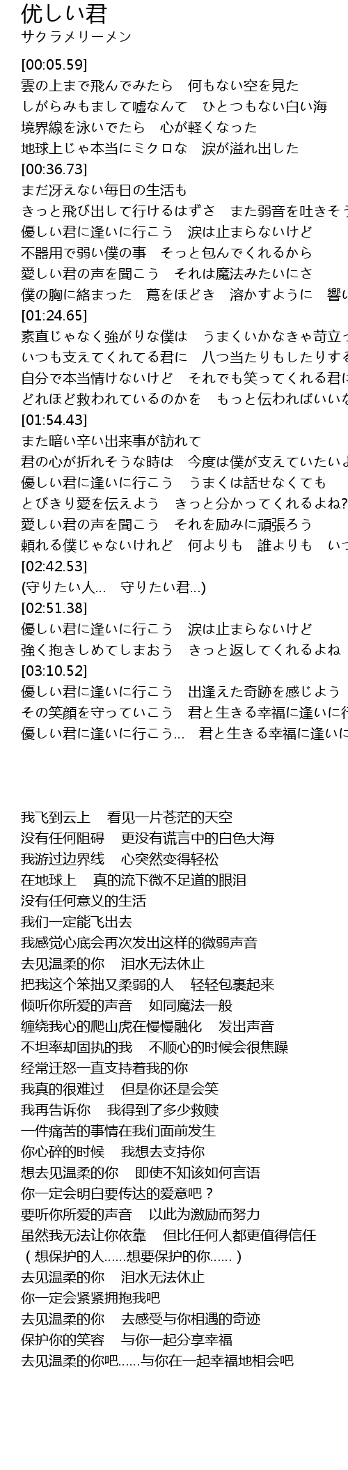 | [02:12.61] | 優しい君に逢いに行こう うまくは話せなくても |