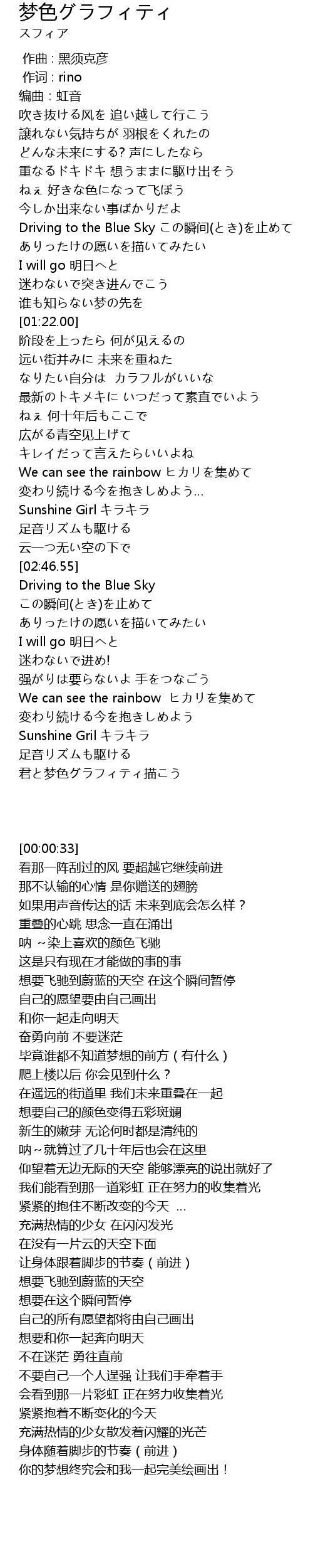 | [00:53.92] | Driving to the Blue Sky この瞬间(とき)を止めて |