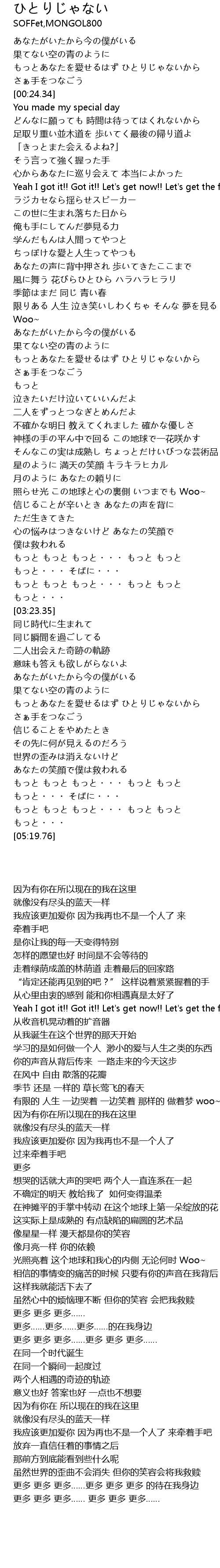 | [01:53.55] | 我应该更加爱你 因为我再也不是一个人了 过来牵着手吧 |