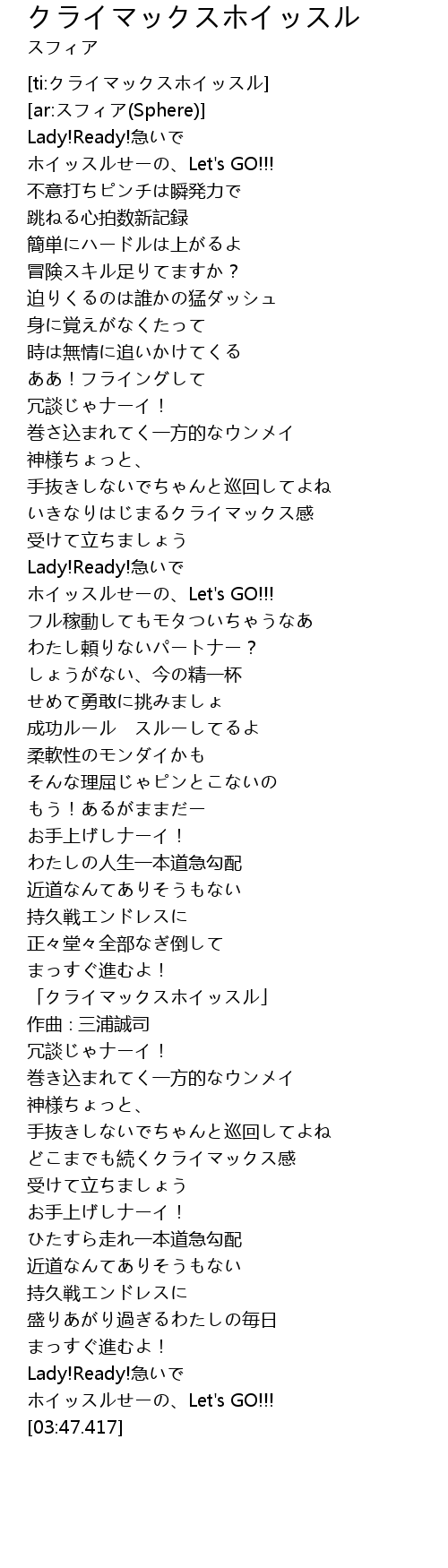 | [03:45.967] | ホイッスルせーの、Let's GO!!! |