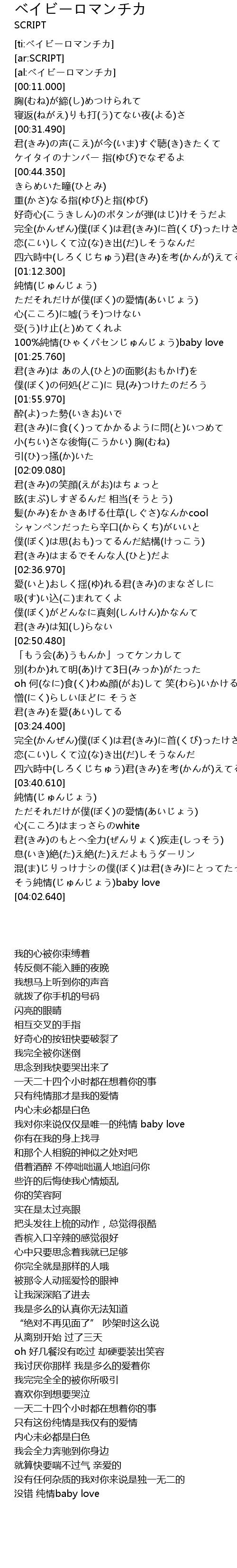 | [01:21.000] | 受(う)け止(と)めてくれよ 100%純情(ひゃくパセンじゅんじょう)baby love |