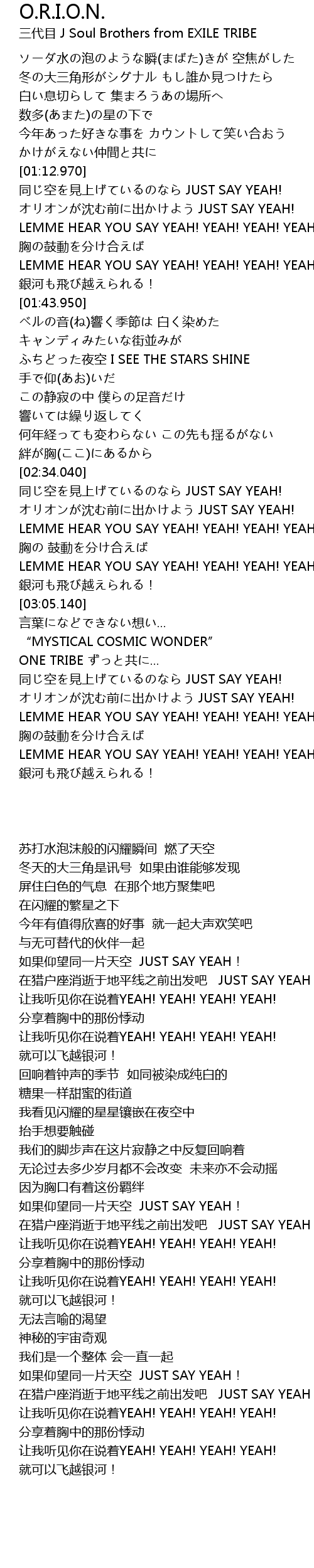 | [02:42.320] | オリオンが沈む前に出かけよう JUST SAY YEAH! |