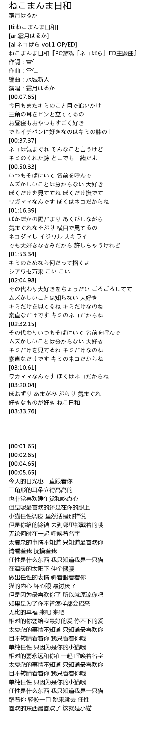 | [00:01.65] | ねこまんま日和『PC游戏「ネコぱら」ED主题曲』 |