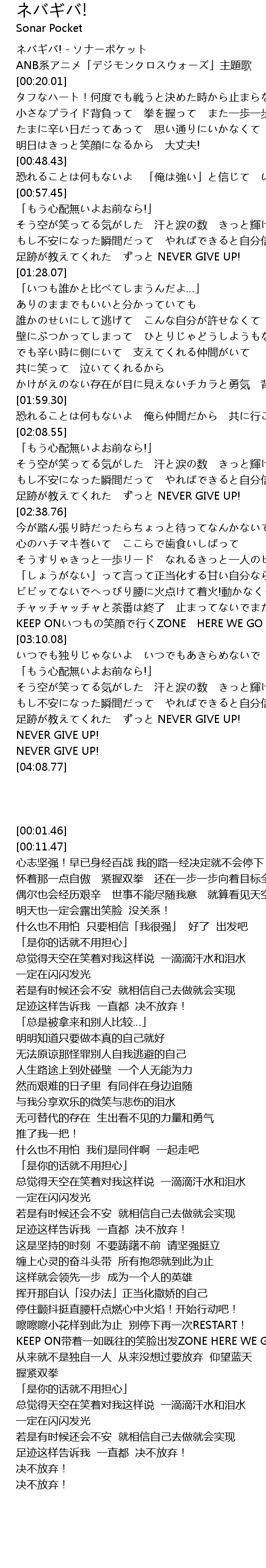 | [00:01.46] | ネバギバ! - ソナーポケット |