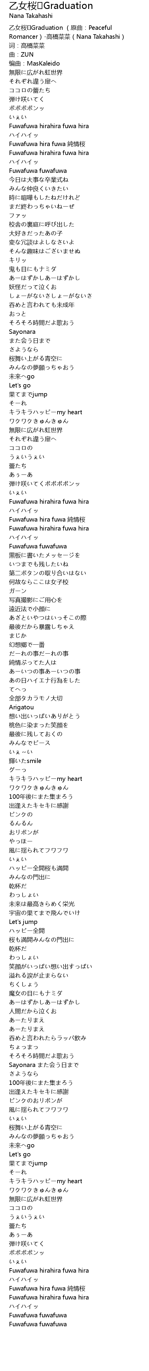 | [00:00.389] | 乙女桜♡Graduation (原曲:Peaceful Romancer)-高橋菜菜(Nana Takahashi) |