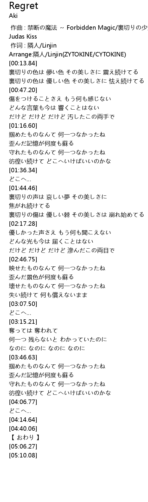 | [00:00.00] | 作曲 : 禁断の魔法 ~ Forbidden Magic/裏切りの少女 ~ Judas Kiss |